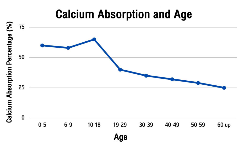 Each time calcium is consumed, the body can absorb only 20-40% of the intake. Studies show that calcium accumulation begins as early as the fetal stage and gradually decreases with age. Notably, after the age of 30, the body is no longer able to store calcium in the bones, emphasizing the importance of maintaining adequate calcium intake throughout life to support bone health and prevent deficiencies.