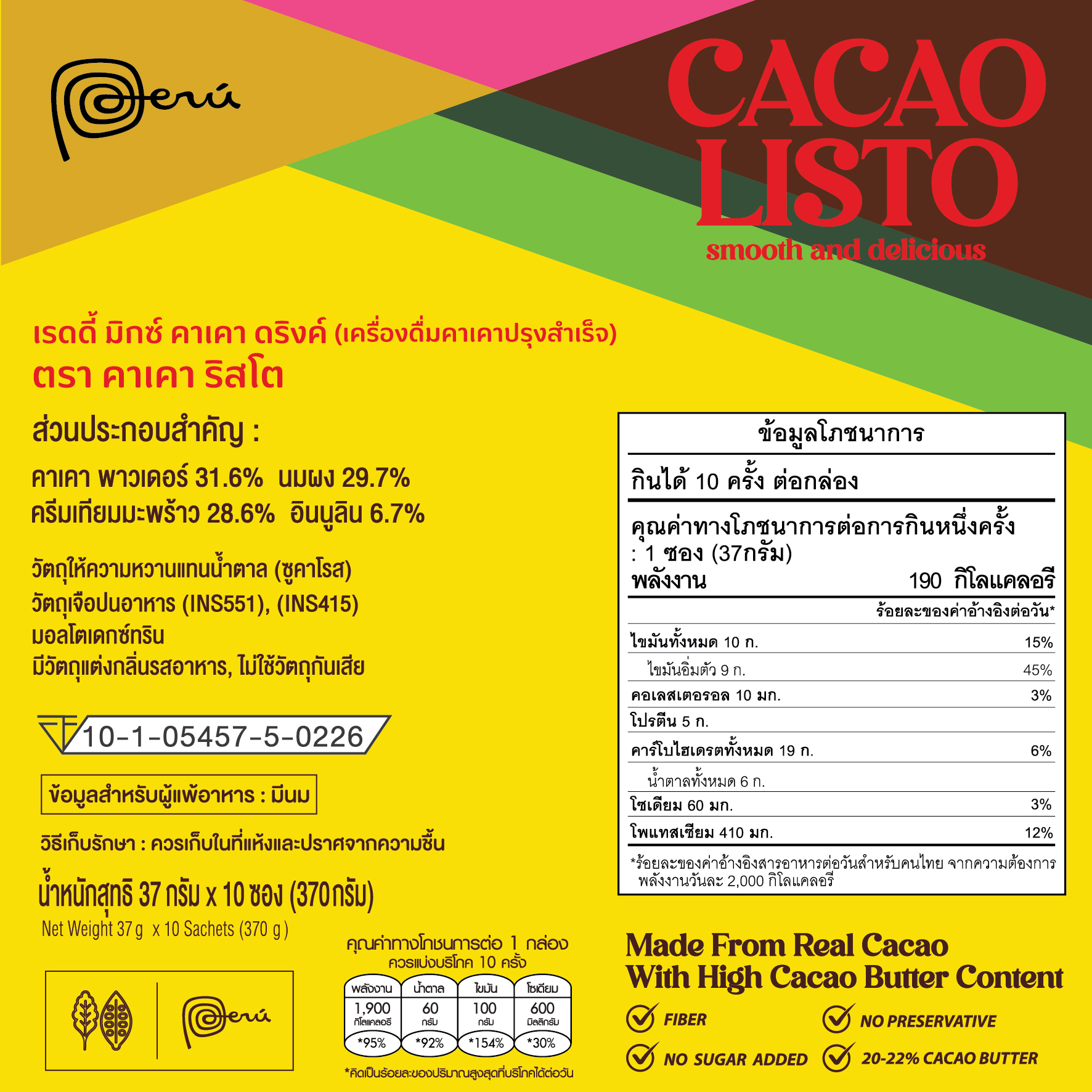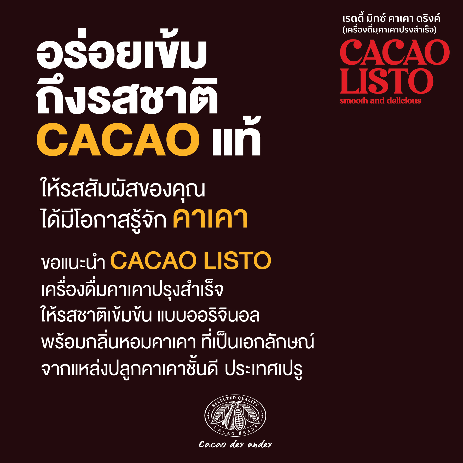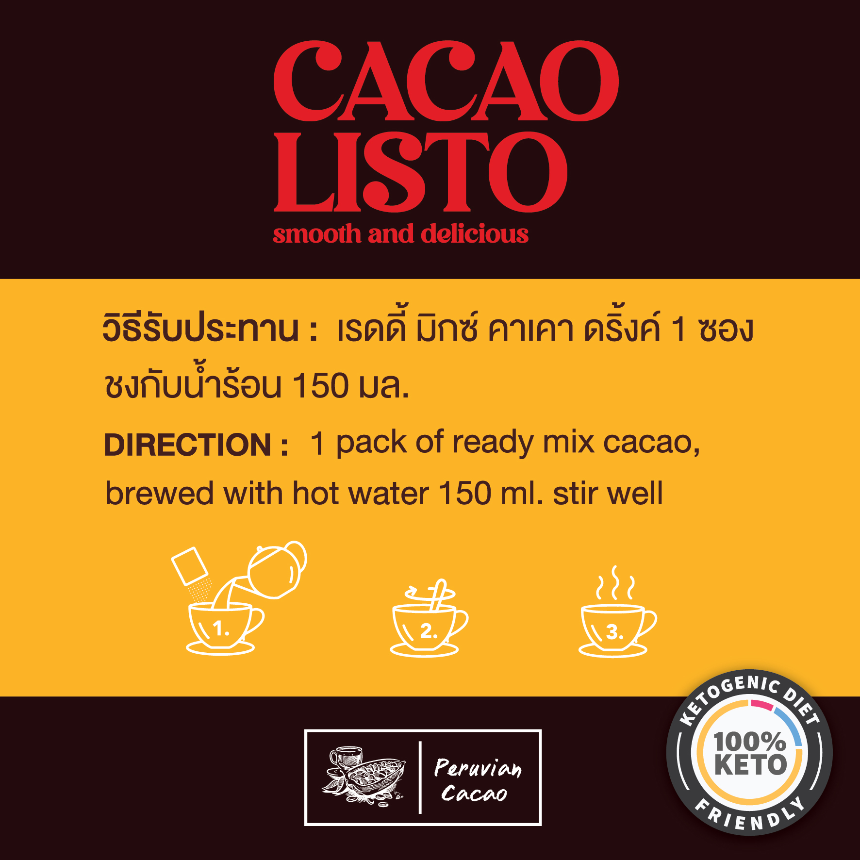 Mix 1 sachet of Ready Mixed Cacao Drink with 150 ml of hot water or hot milk.