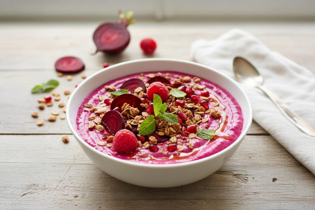 วิธีทำ1.ผสม โยเกิร์ต + ผงบีทรูท ให้เข้ากันจนได้สีชมพูเนียนสวย2.เติม น้ำผึ้ง/เมเปิลไซรัป คนอีกครั้งเพื่อบาลานซ์รส3.ตักใส่ถ้วย4.โรย กราโนล่า + ผลไม้สด ตามชอบ5.ถ้าต้องการ Texture ให้โรยเมล็ดเชียหรืออัลมอนด์เพิ่มเล็กน้อย