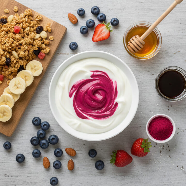 วัตถุดิบ : โยเกิร์ตธรรมดา/กรีกโยเกิร์ต 150–180 gผงบีทรูท 1–2 ช้อนชาน้ำผึ้ง / เมเปิลไซรัป 1–2 ช้อนชา (ปรับตามหวาน) กราโนล่า 2–4 ช้อนโต๊ะผลไม้สด (เช่น กล้วย สตรอว์เบอร์รี่ บลูเบอร์รี่) ตามชอบเมล็ดเชีย/อัลมอนด์สไลซ์ (ไม่บังคับ) เล็กน้อย เพิ่ม Texture