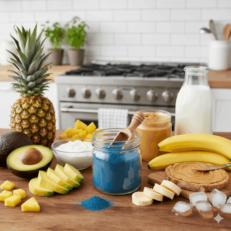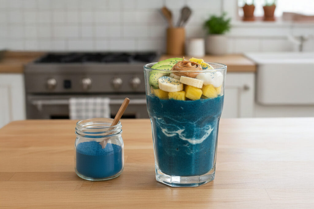 วัตถุดิบ : ผงบลูสไปรูลิน่าสีฟ้า ¼ ช้อนชาอะโวคาโด้ ½ ลูกสับประรด ½ ถ้วยกล้วยหอมสุก 1 ลูก,เนยถั่ว 1 ช้อนโต๊ะกรีกโยเกิร์ต 1 ช้อนโต๊ะนมสดพาสเจอร์ไรซ์ 1 ถ้วยน้ำเเข็ง ½ ถ้วย