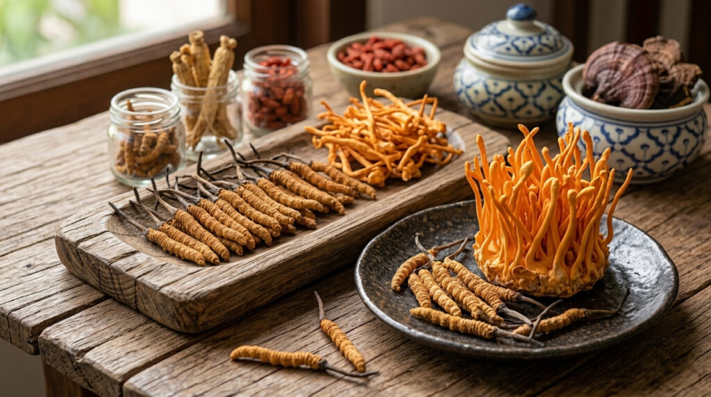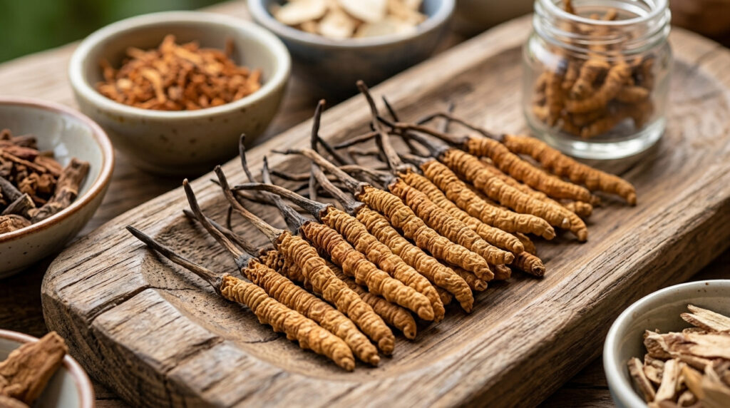 เป็นสมุนไพรจีนที่เป็นส่วนผสมของเห็ดราและสัตว์ เกิดจากหนอนผีเสื้อกลางคืนแถบที่ราบสูงทิเบตที่จำศีลอยู่ใต้ดินในฤดูหนาว