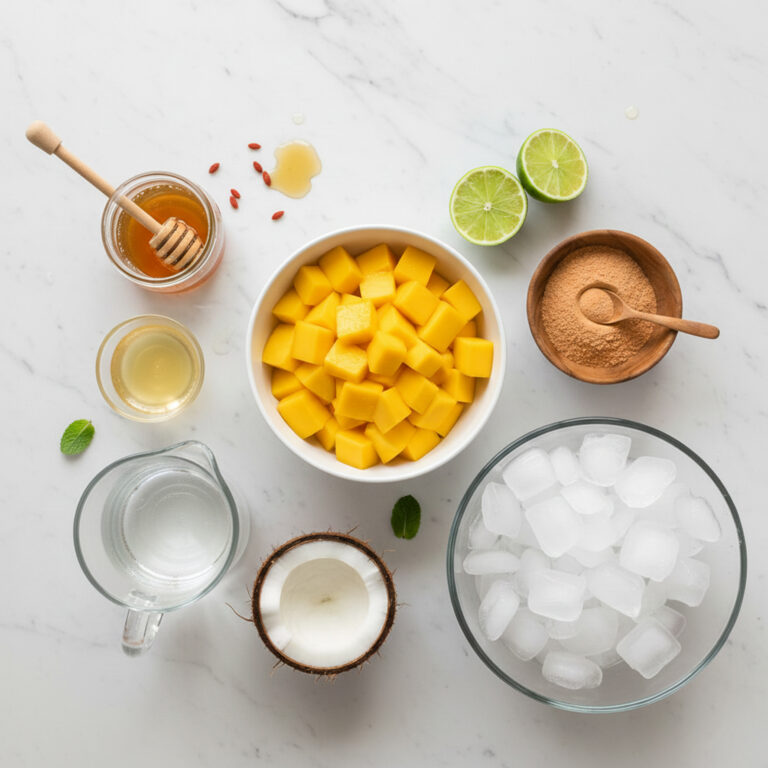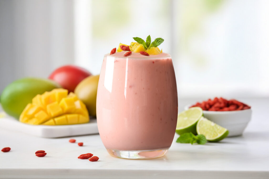 วัตถุดิบ :มะม่วงสุกหั่นชิ้น 1 ถ้วยผงโกจิเบอร์รี่ 2 ช้อนโต๊ะน้ำมะนาวสด 2 ช้อนโต๊ะน้ำผึ้งหรือไซรัป 1–2 ช้อนโต๊ะ (ตามความชอบ)น้ำแข็ง 1 ถ้วยน้ำเย็นหรือน้ำมะพร้าว ½ ถ้วย (เพิ่มความหอมสดชื่น)