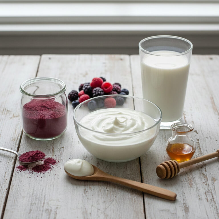 วัตถุดิบ : ผงมิกซ์เบอร์รี่นมสดพาสเจอร์ไรซ์รสจืดโยเกิร์ตรธรรมชาติ