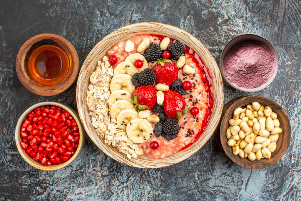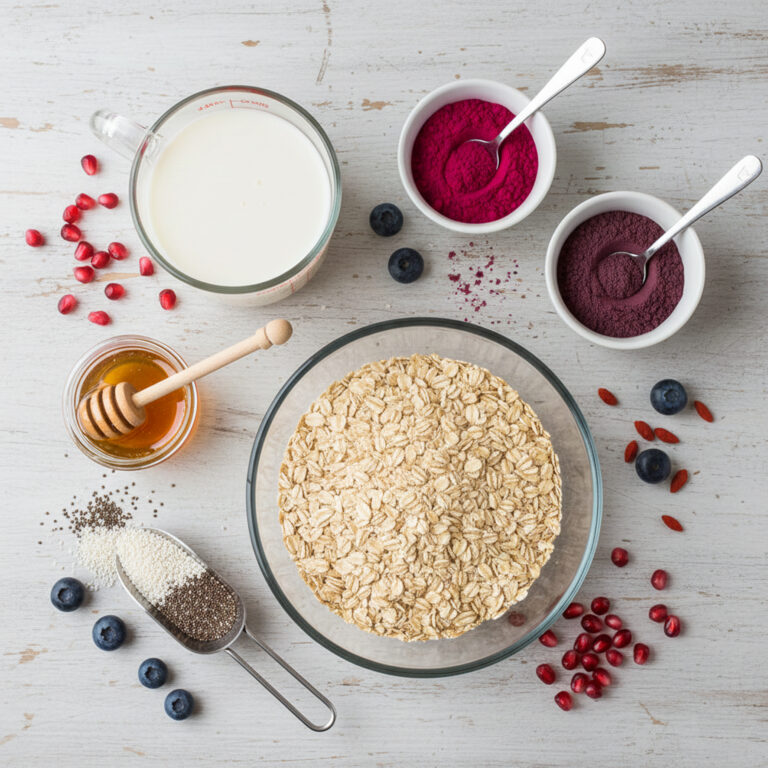 วัตถุดิบ : ข้าวโอ็ต 1 ถ้วยนมอัลมอนด์/นมพืช 1 ถ้วยผงทับทิม 1 ช้อนชาผงมิกซ์เบอร์รี่ 1 ช้อนชา, เมล็ดเชีย 1 ช้อนโต๊ะน้ำผึ้ง