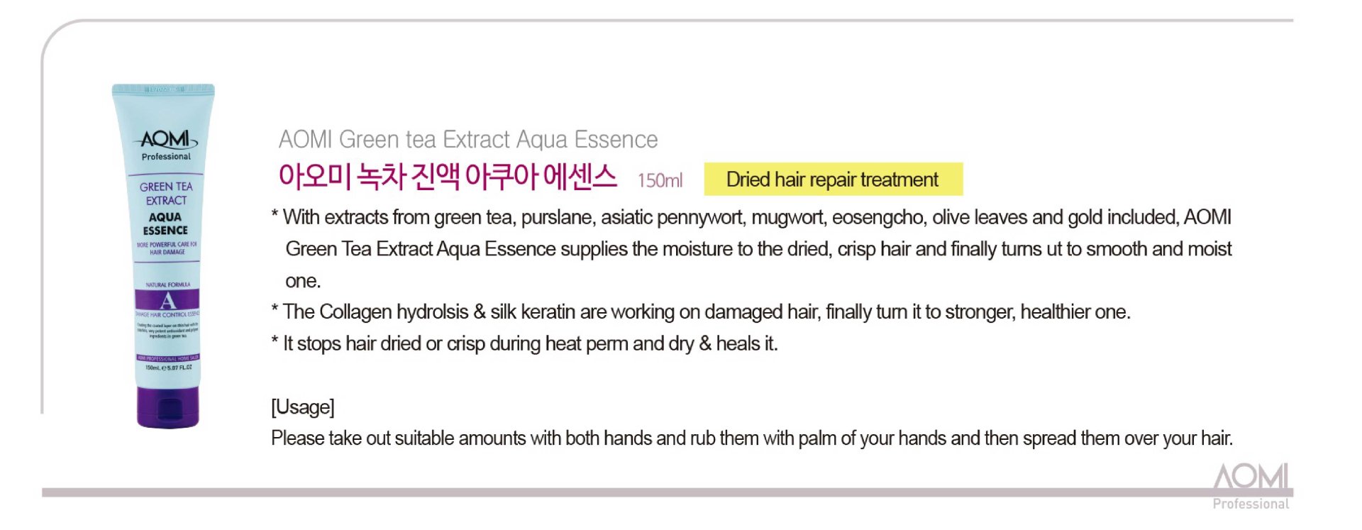 อุดมด้วยสารสกัดอันทรงคุณค่า ทั้งสารสกัดจากใบชา ผักเบี้ยใหญ่ ใบบัวบกพืชสมุนไพรเกาหลี ต้นคาวทอง ใบมะกอก รากสคิวราเลีย ช่วยเพิ่มความชุ่มชื้นให้กับเส้นผมที่แห้งเสียและหยาบกร้าน ทำให้เส้นผมกลับมานุ่มลื่นเงางาม ไฮโดรไลซ์ คอลลาเจน, ซิลค์ และเคราติน มีส่วนช่วยฟื้นฟู บำรุง ซ่อมแซมส่วนที่เสียหายอย่างล้ำลึกทำให้เส้นผมกลับมามีสุขภาพแข็งแรง