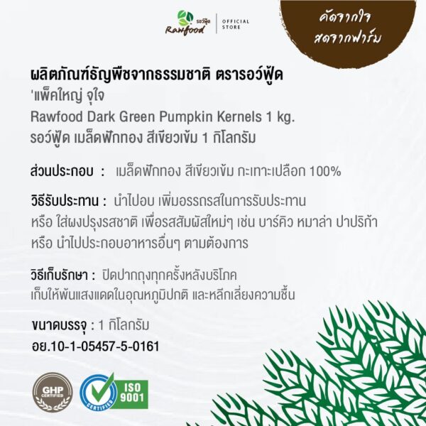 ส่วนประกอบ : เมล็ดฟักทอง กระเทาะเปลือก ออร์แกนิค 100%