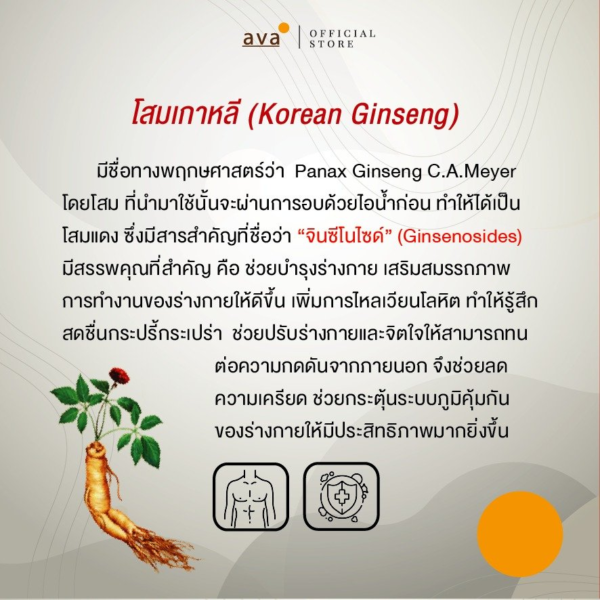 – Korean Ginseng Extract (โสมเกาหลีสกัด) 80 mg.